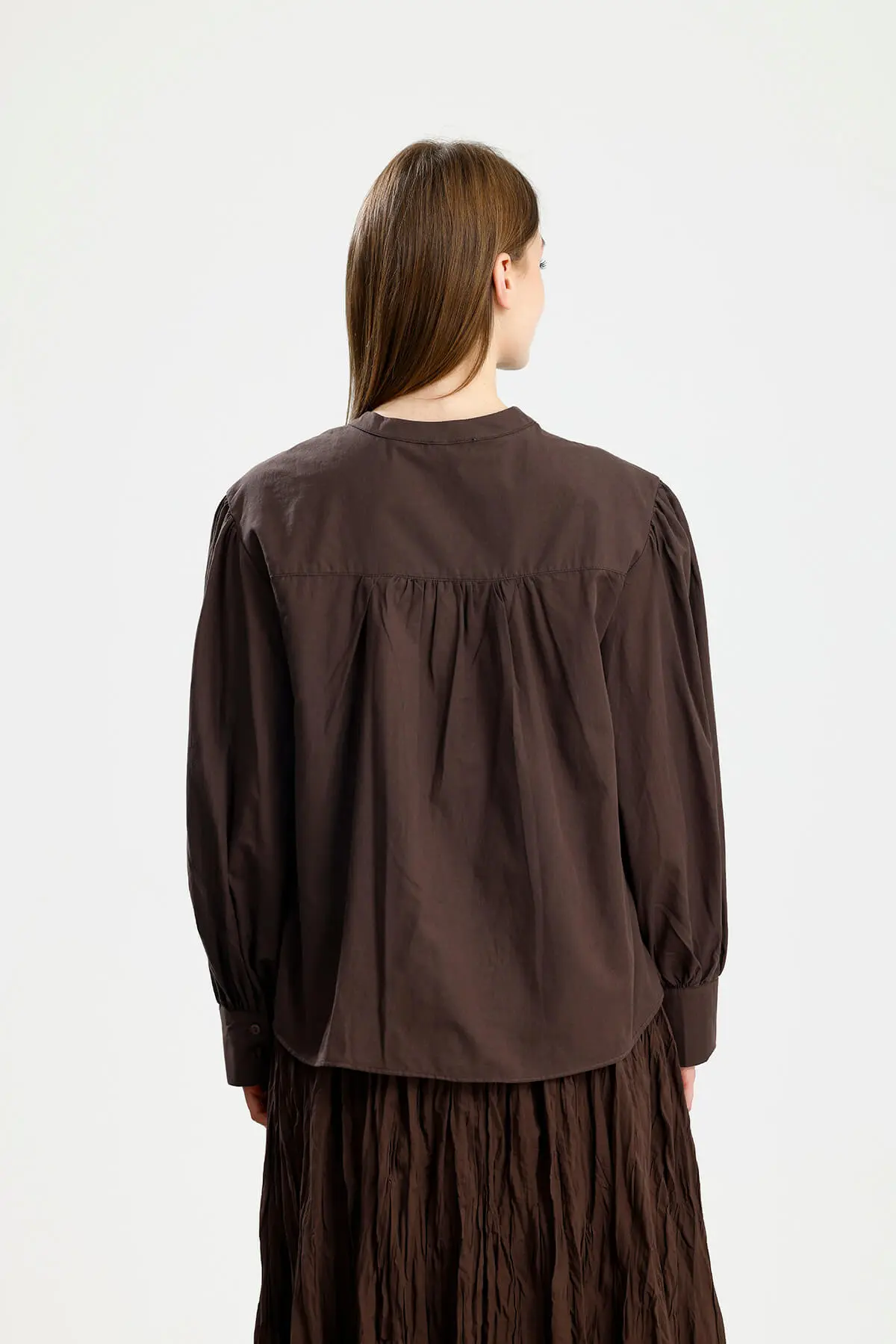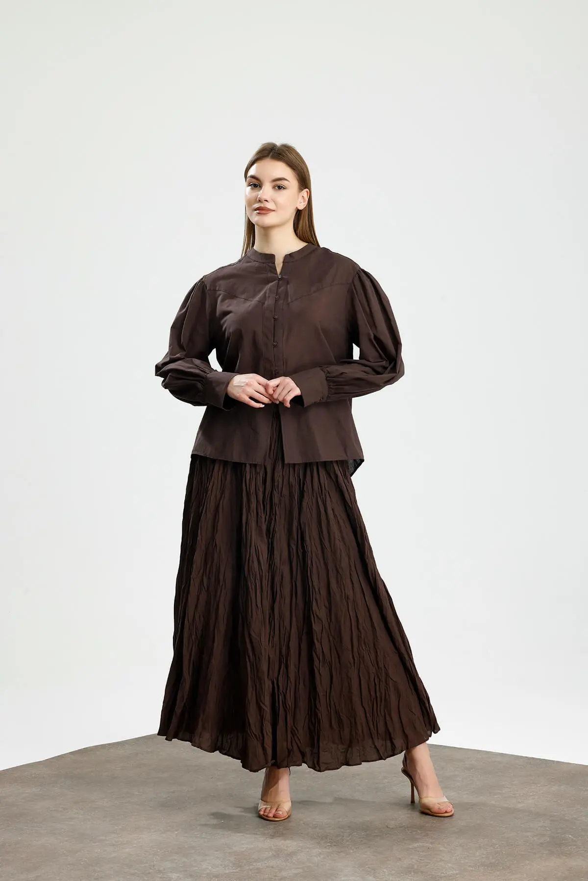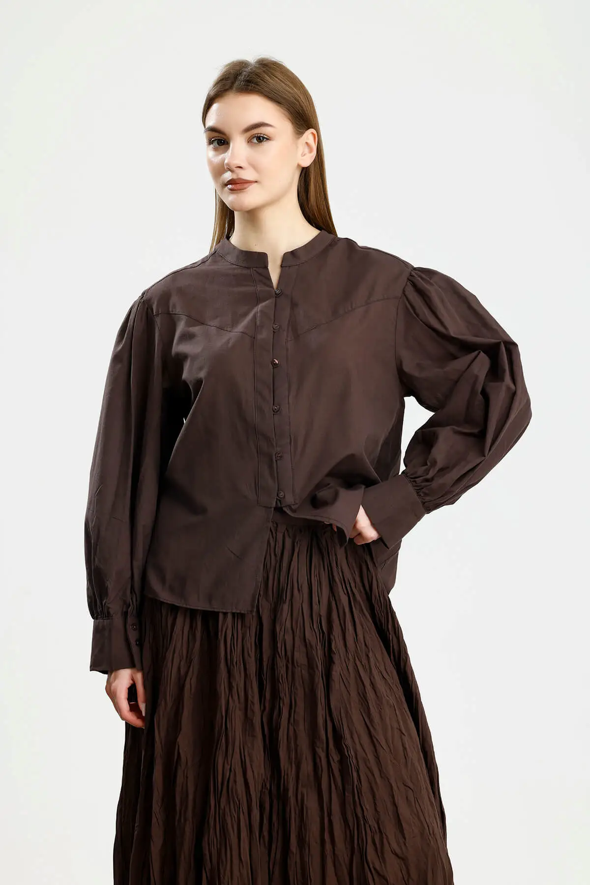 Oversize kalıp, C yaka, uzun balon kol, uzun manşet, biritli düğme kapama, manşet-omuz-sırt büzgü detaylı, pamuklu ve nefes alan kumaş.