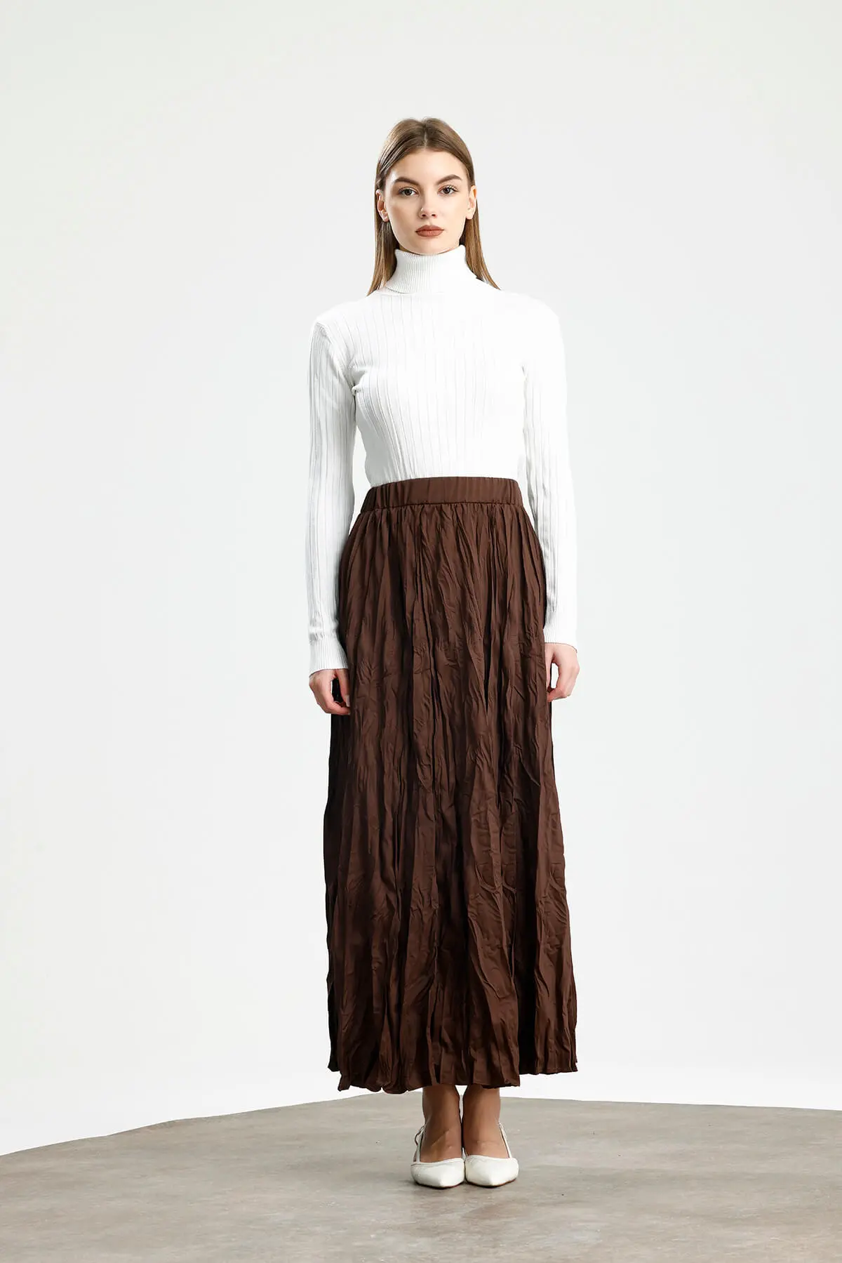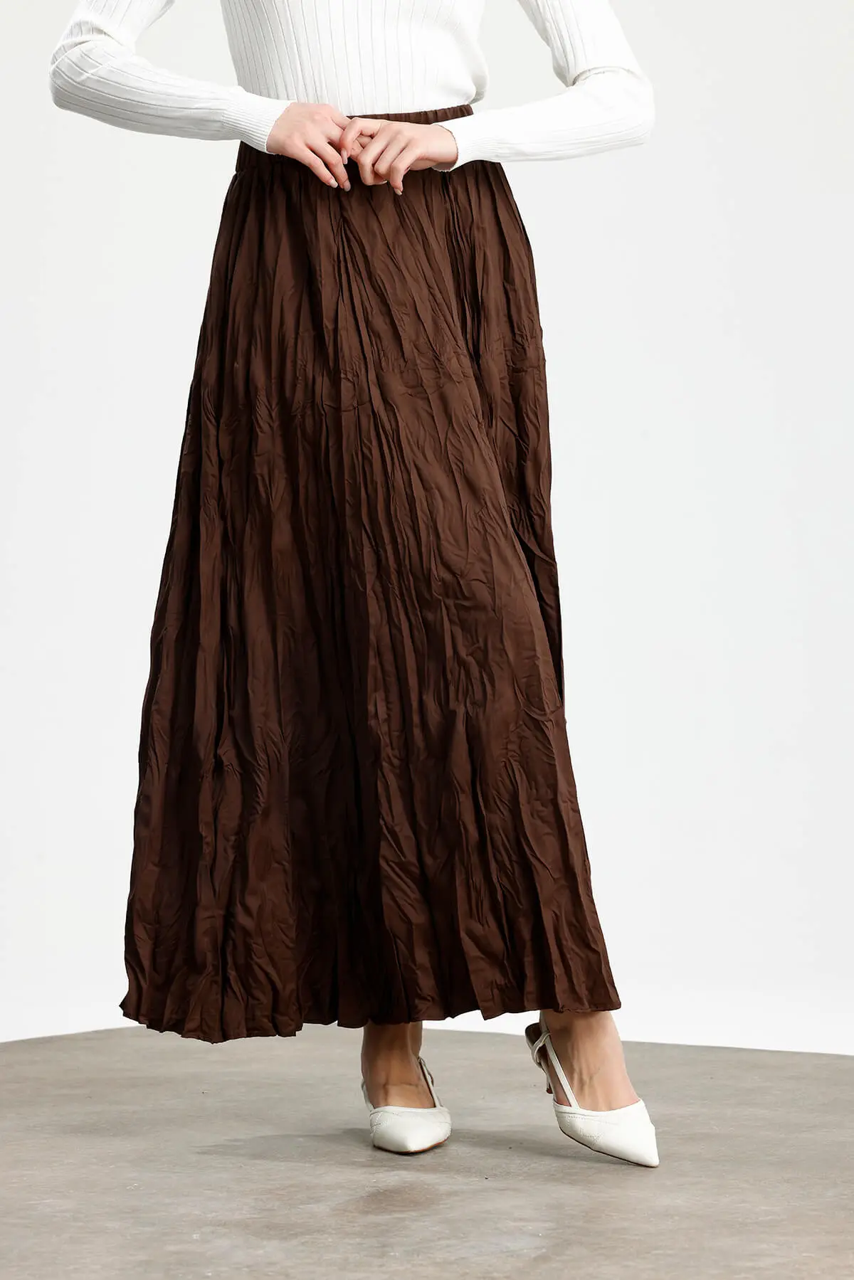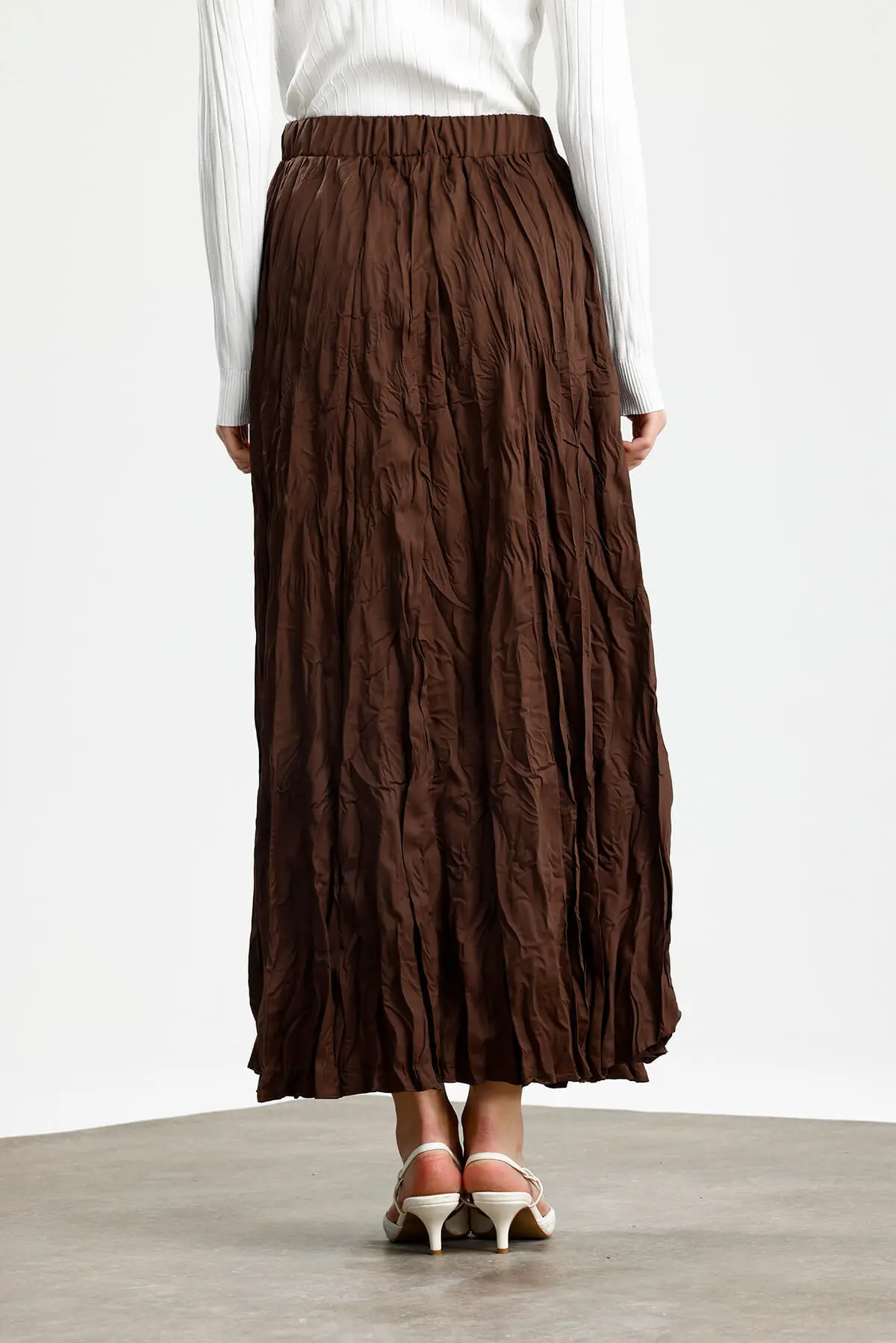 Yüksek bel, büzgü detaylı, geniş etek, bel lastik, crush görünümlü, yumuşak dokulu, iç göstermez.