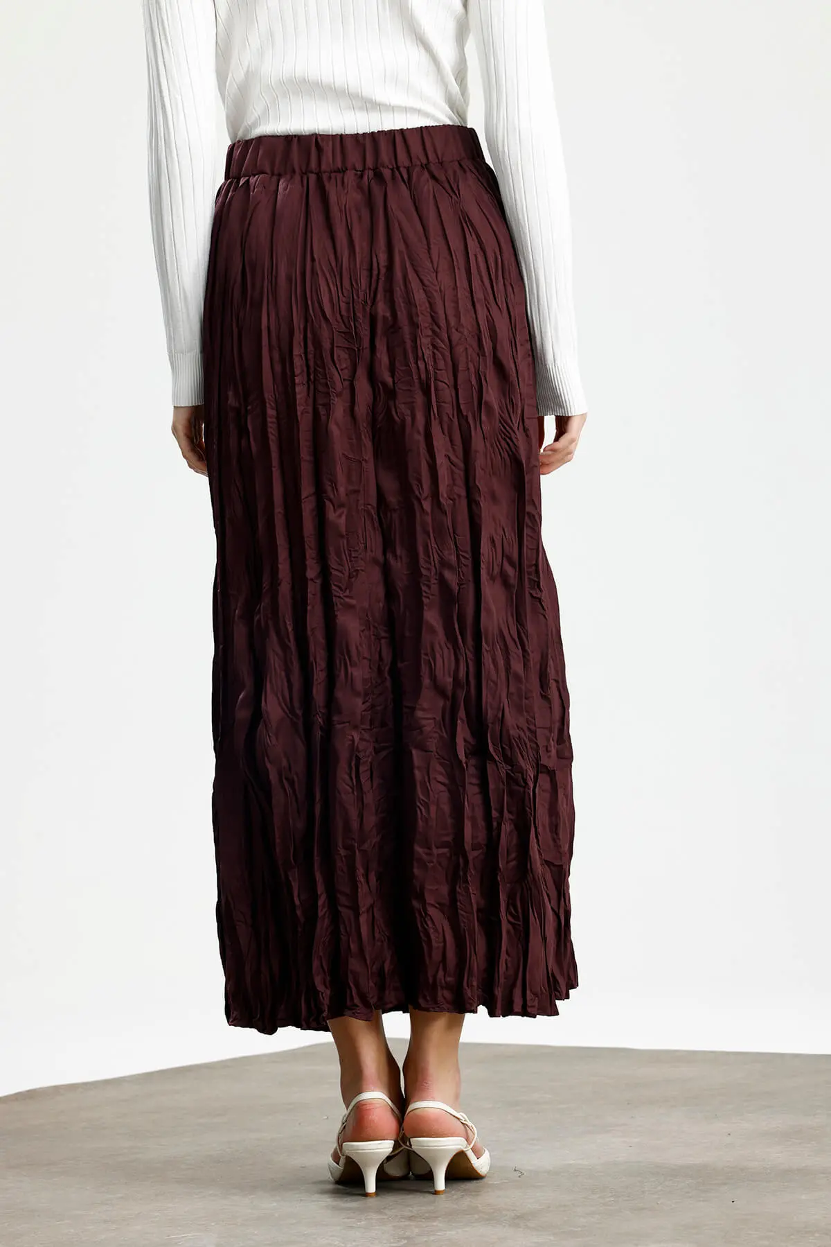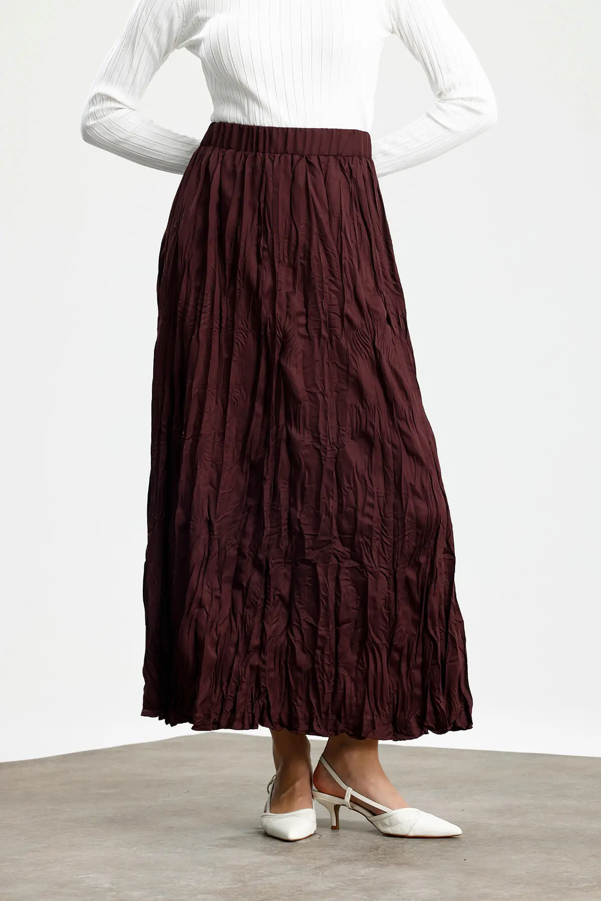 Yüksek bel, büzgü detaylı, geniş etek, bel lastik, crush görünümlü, yumuşak dokulu, iç göstermez.