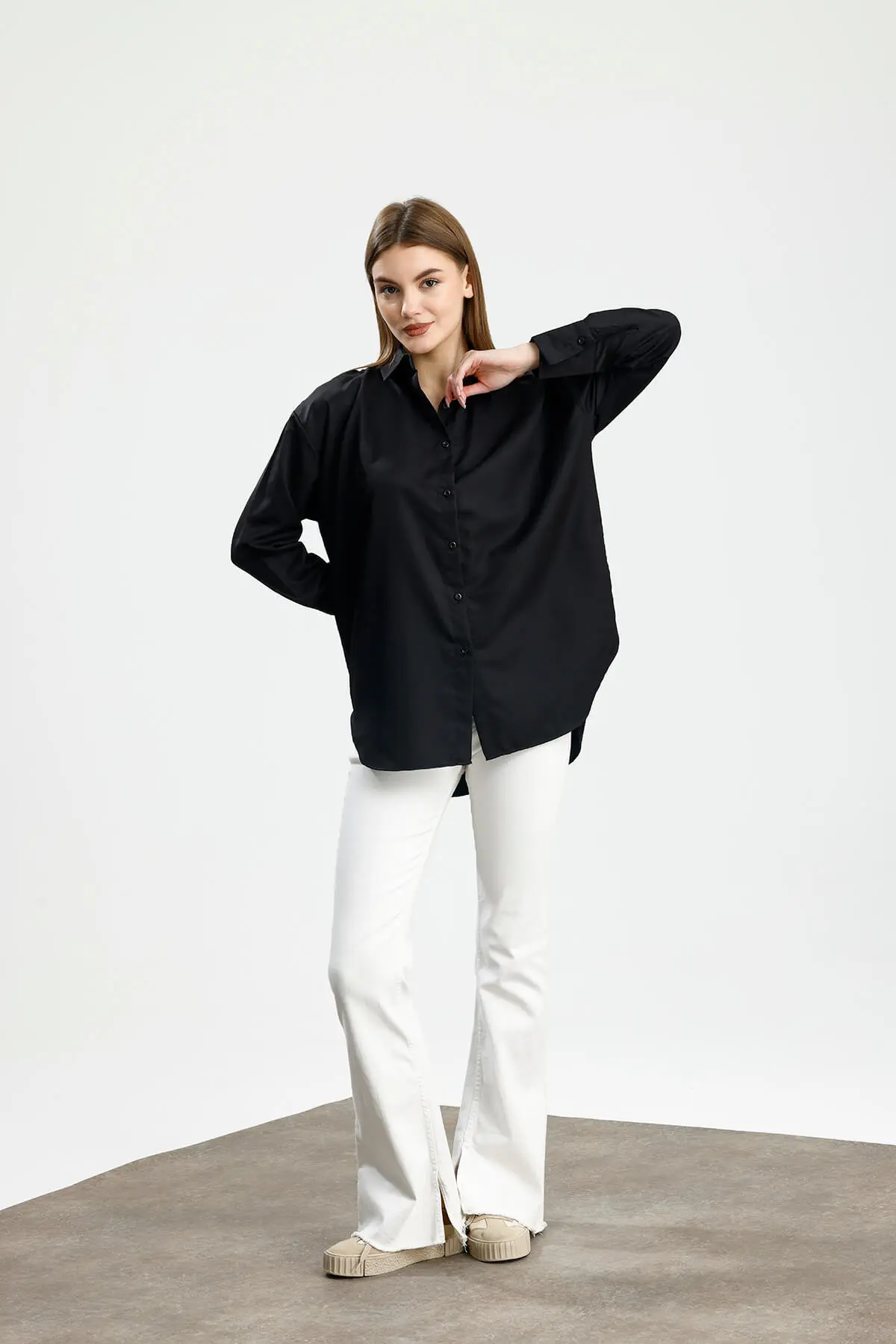 Oversize kalıp, gömlek yaka, uzun kol, uzun manşet, düğmeli kapama, yumuşak dokulu saten gömlek.