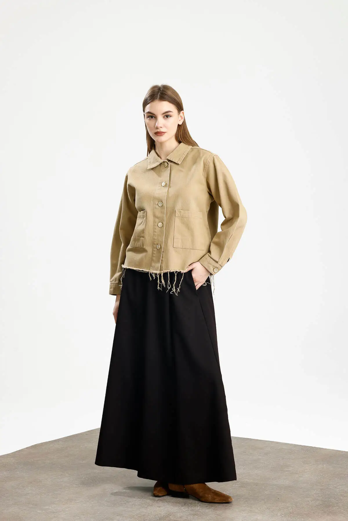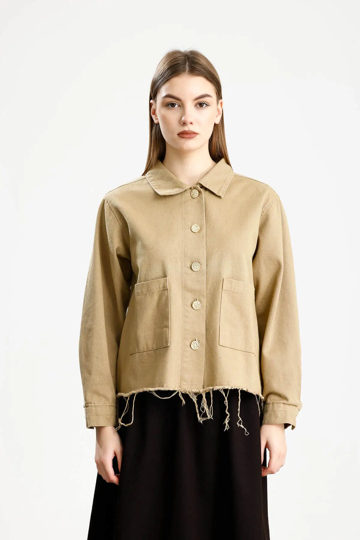 Pis dikiş görünümlü, cepli, metal düğmeli, normal manşet, yumuşak dokulu gabardin ceket.