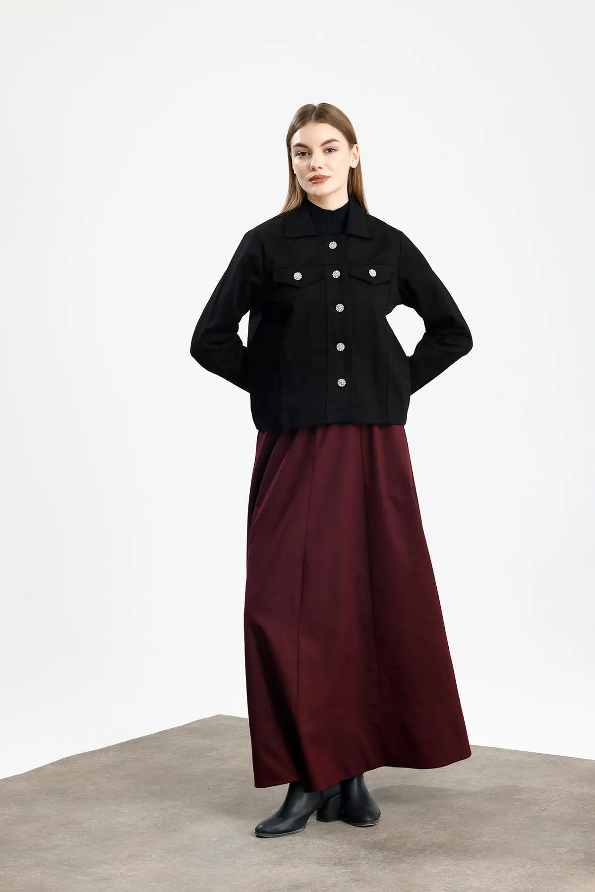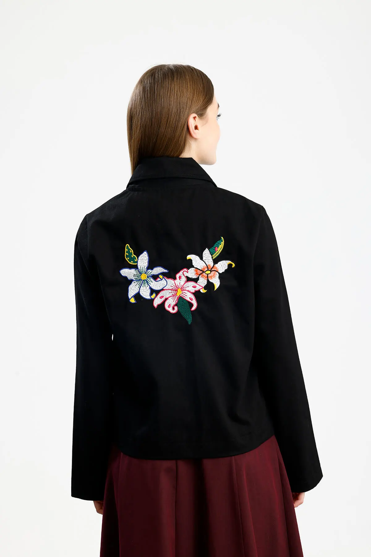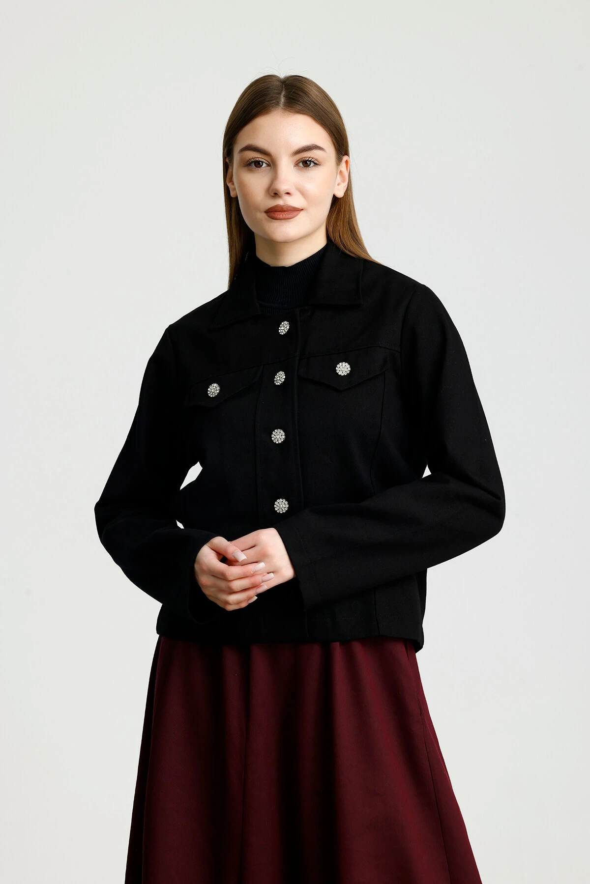 Cep kapak görünümlü, düz manşet, metalize parlak düğme, nakış detaylı, yumuşak dokulu gabardin ceket.