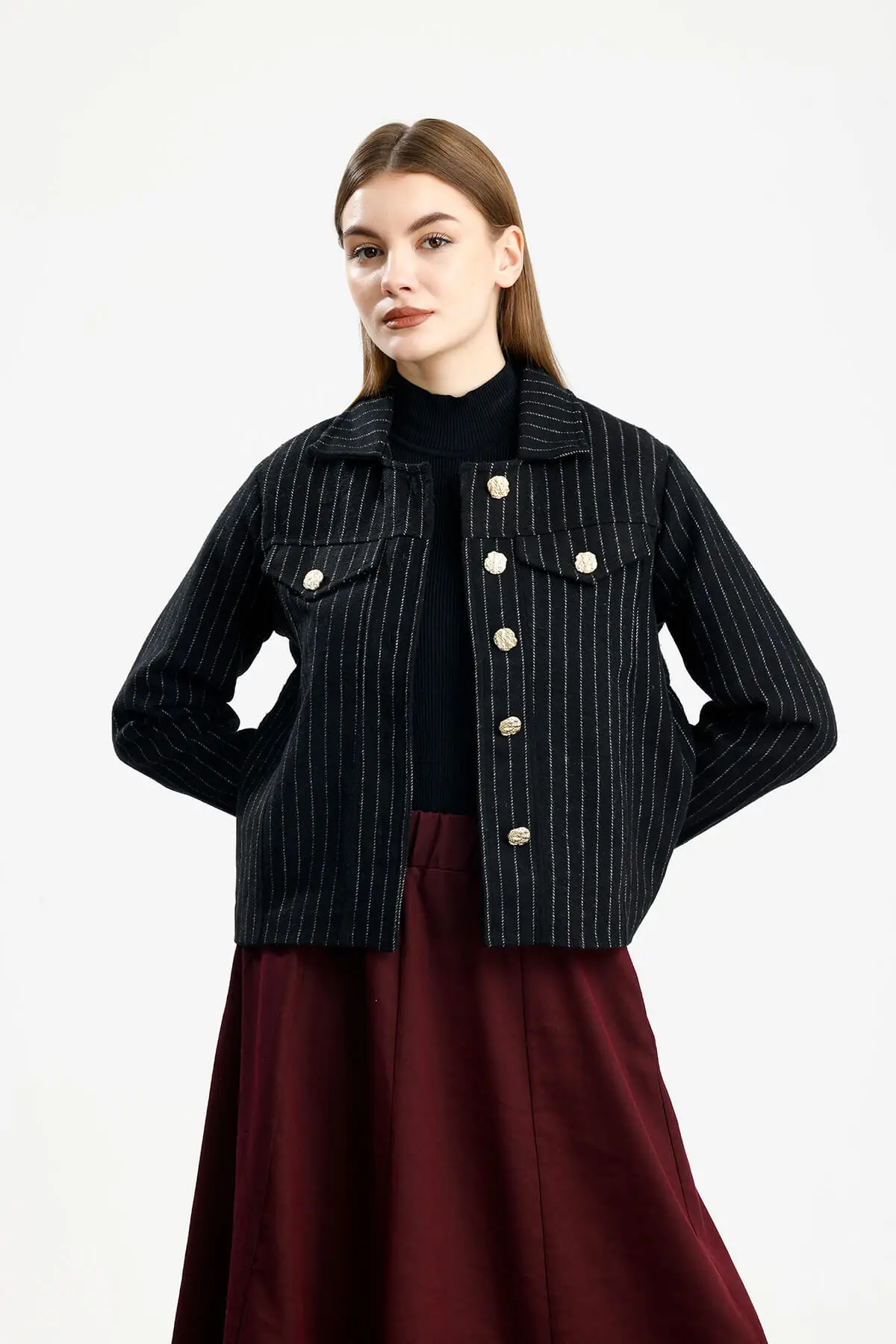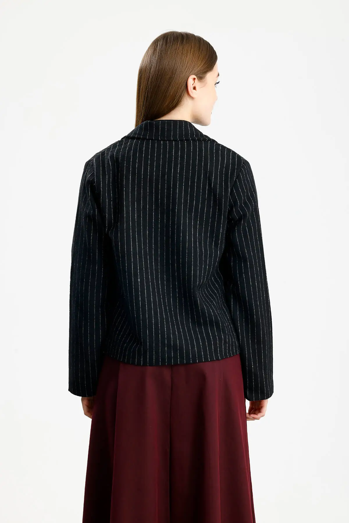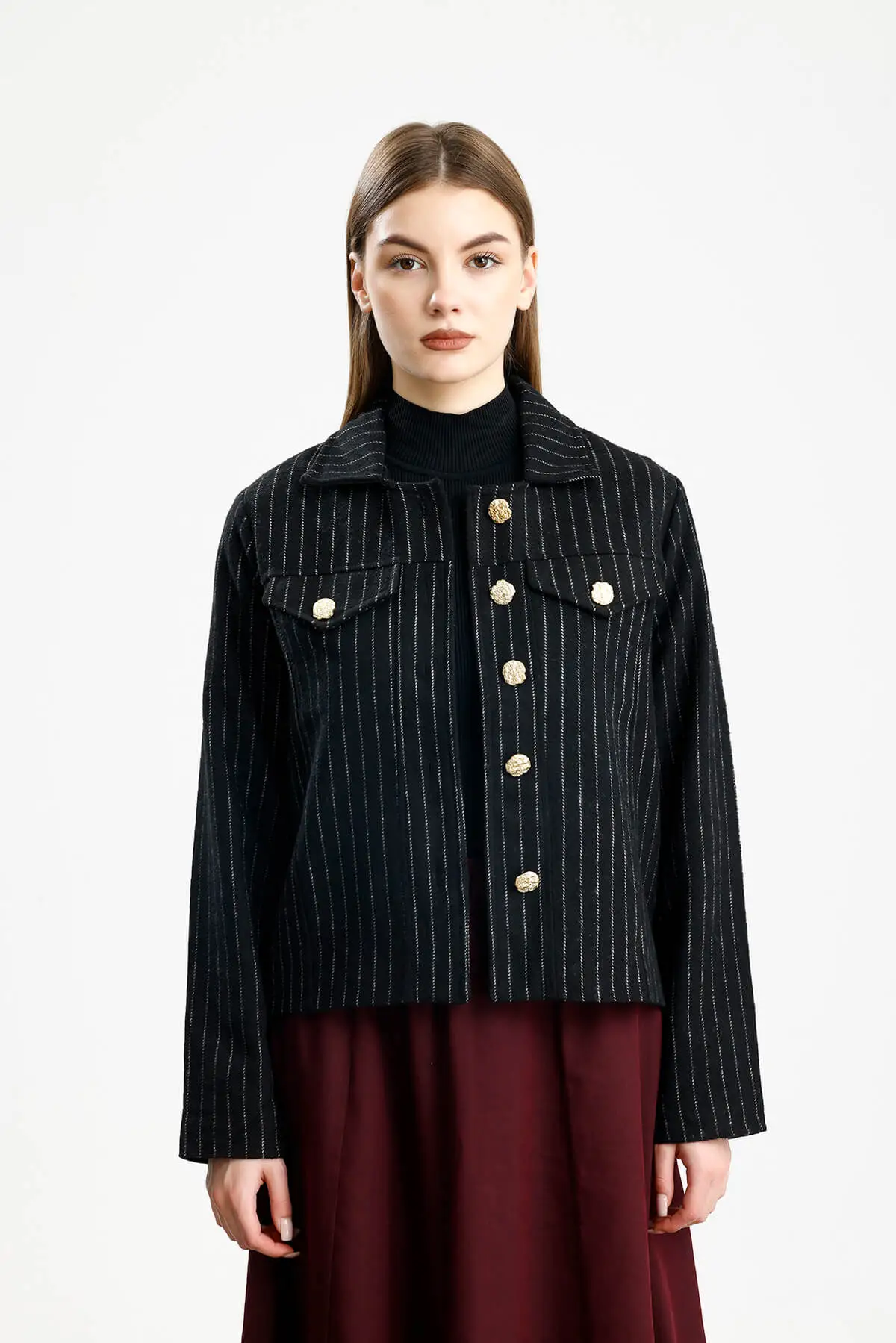 Astarlı, kapaklı cep görünümlü, metal düğmeli, düz manşet, yumuşak dokulu kaşe ceket.