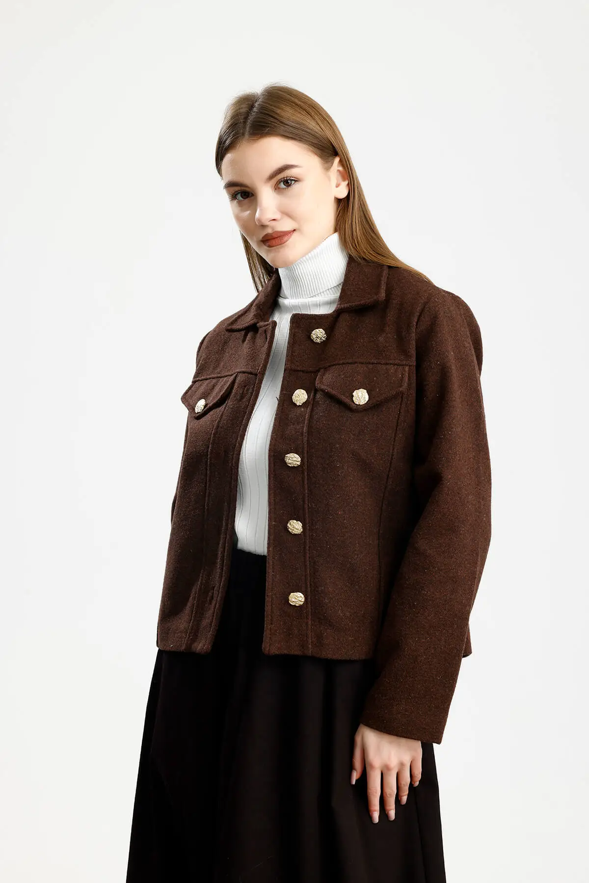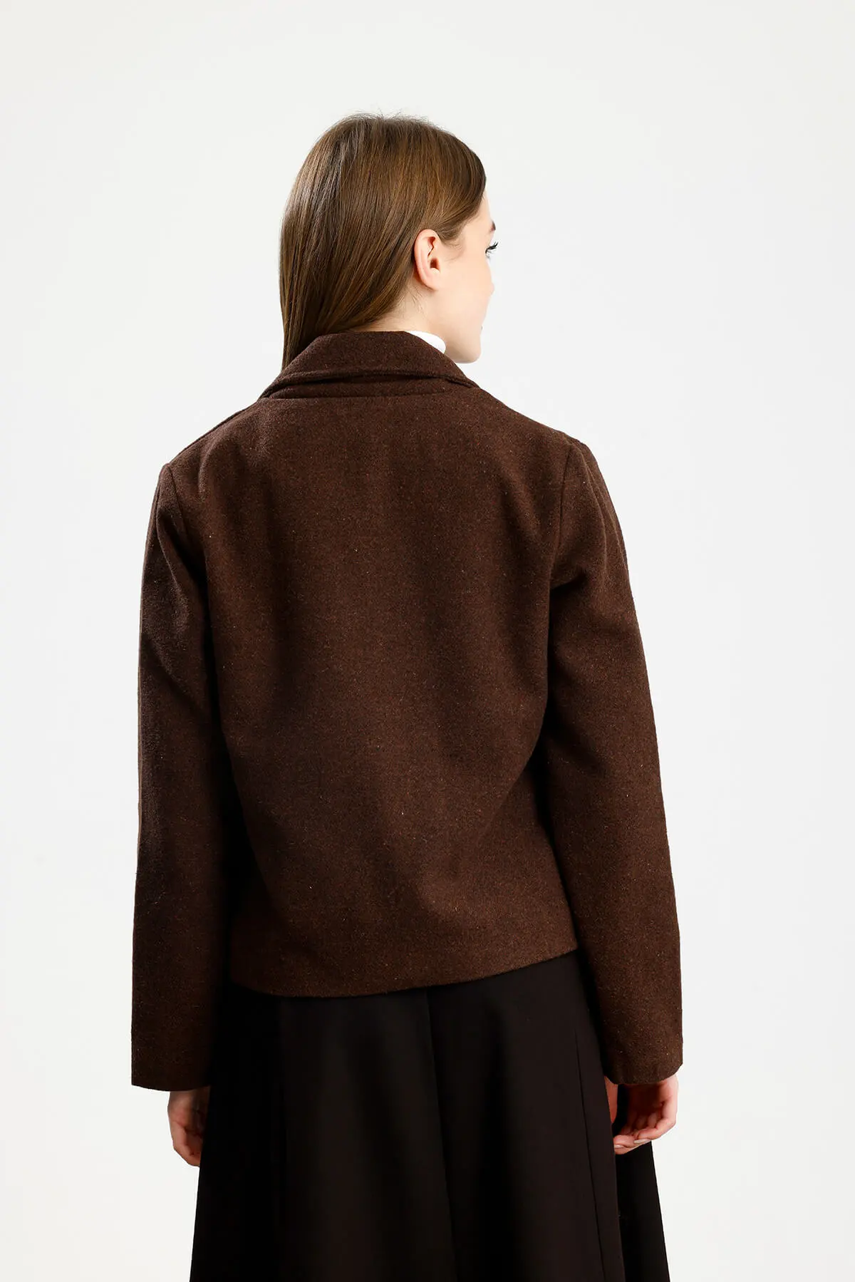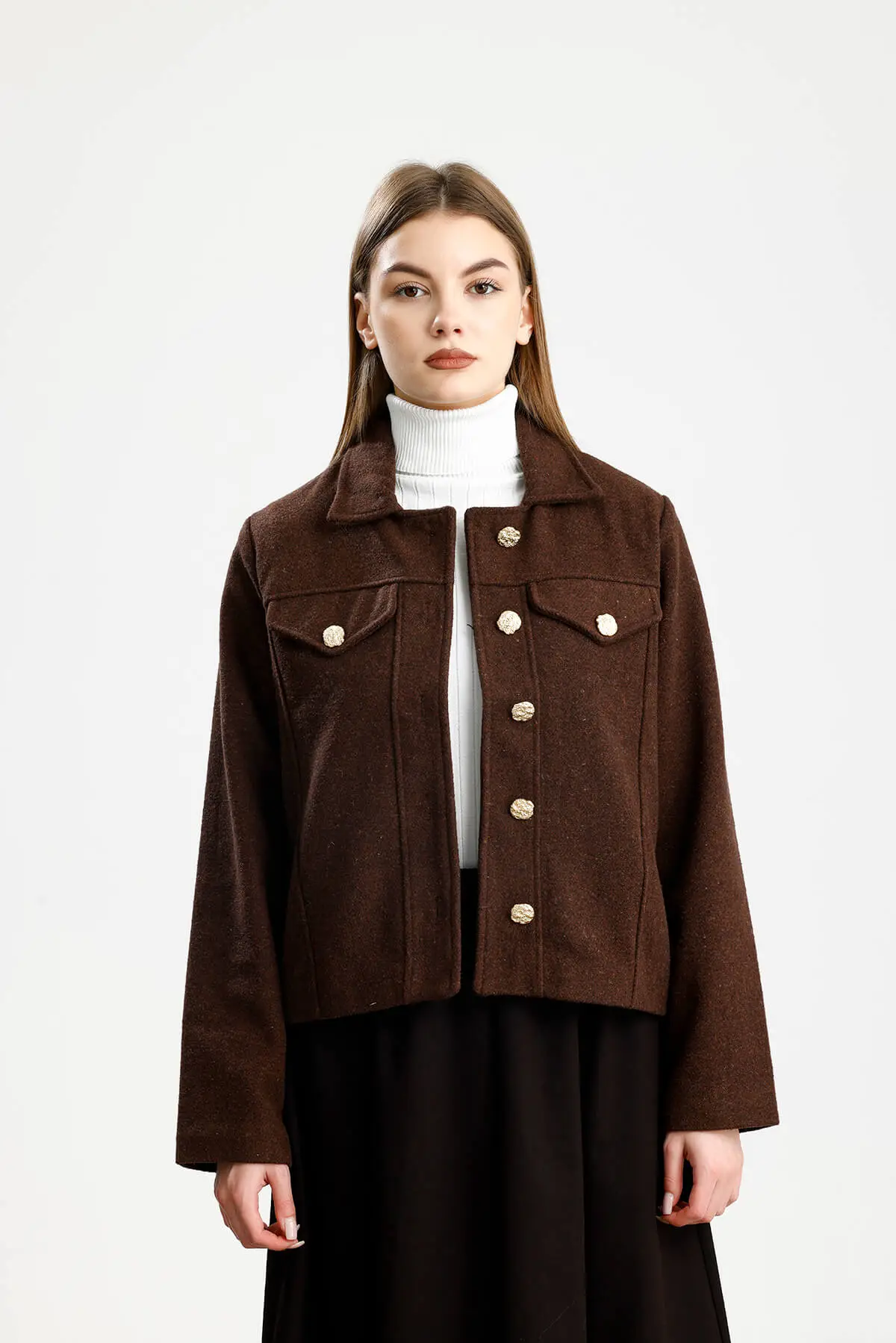Astarlı, kapaklı cep görünümlü, metal düğmeli, düz manşet, yumuşak dokulu kaşe ceket.