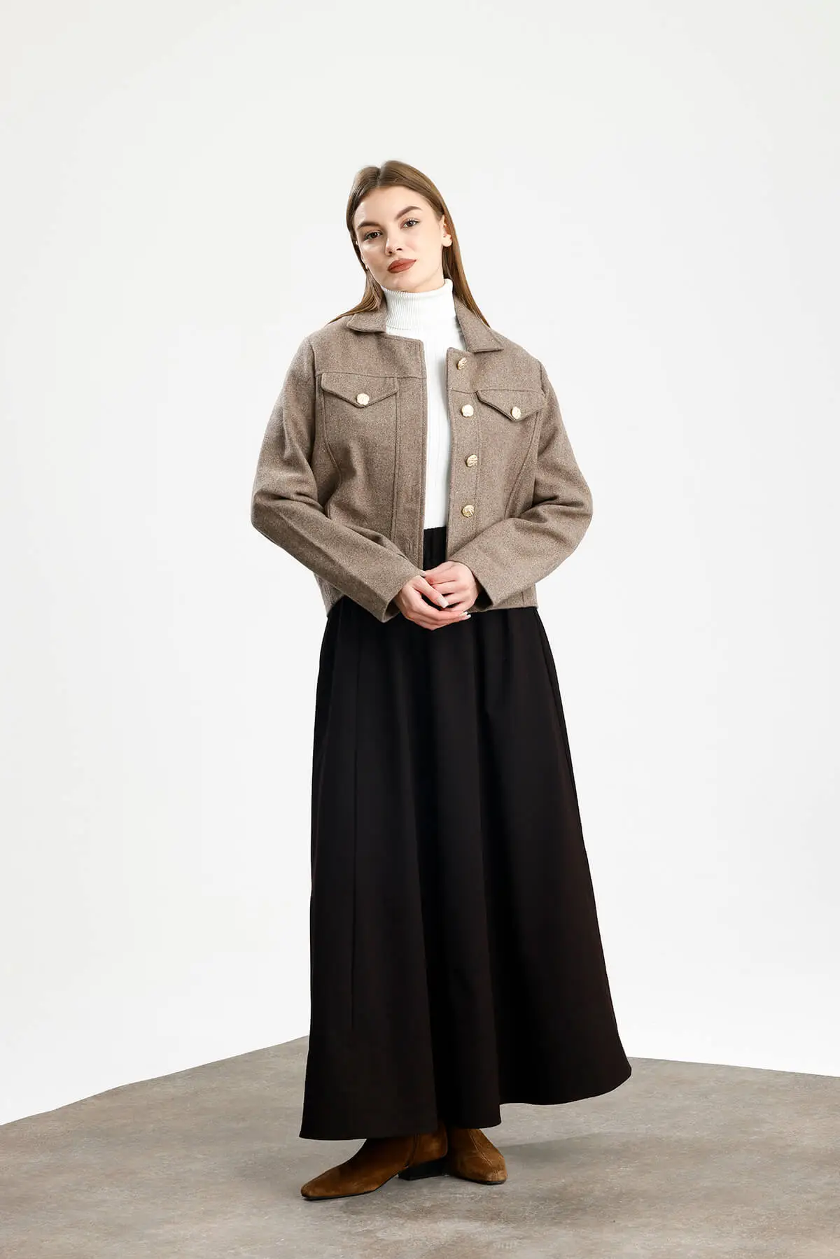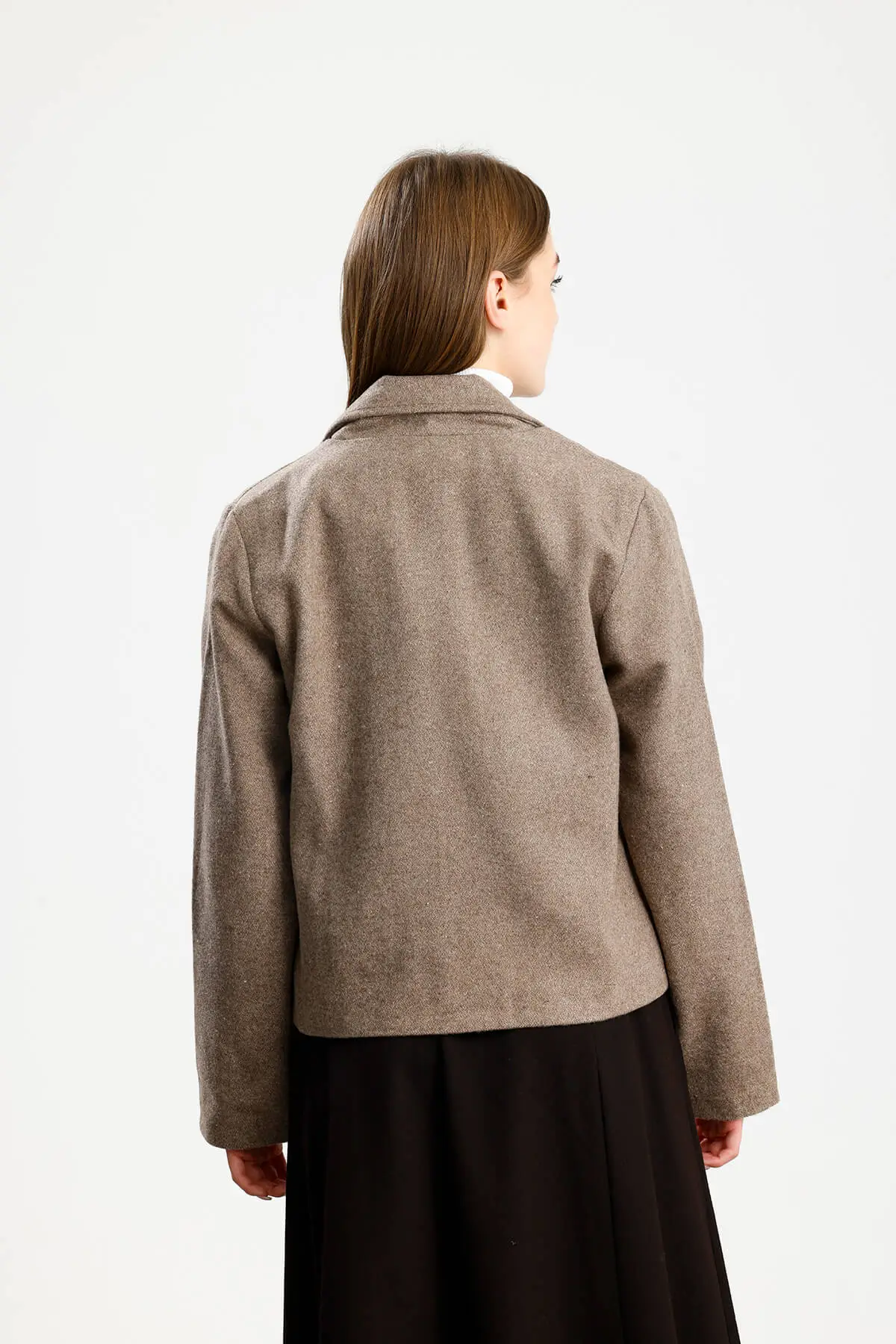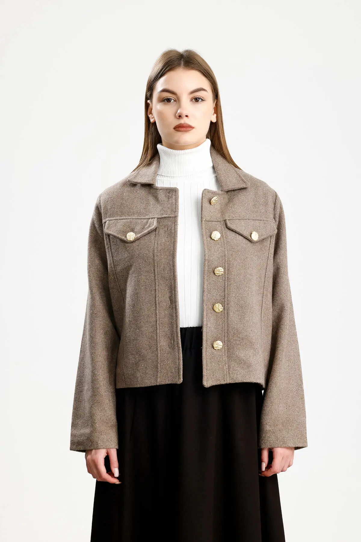 Astarlı, kapaklı cep görünümlü, metal düğmeli, düz manşet, yumuşak dokulu kaşe ceket.